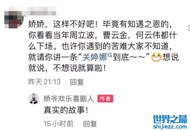 其实,一开始娇娇只把矛头指向赵本山一人,后来却突然回复一位网友的评论,暗戳戳说赵本山和旗下艺人关婷娜之间的绯闻是真实的故事。关婷娜多了一波热度,同时否认和赵本山之间的事儿,娇娇很快也删除了那条回复。