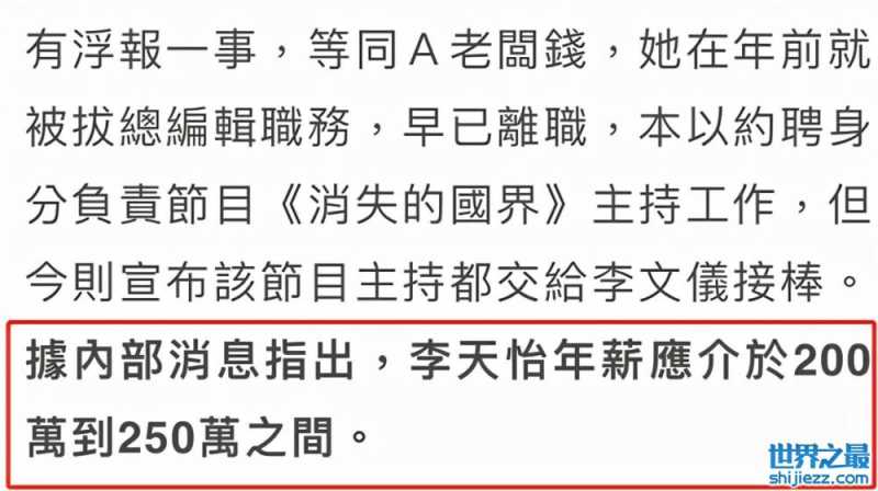 李天怡现在是以约聘的身份负责节目《消失的国界》,据内部报道,她的年薪在两百万台币左右,约合人民币46万。目前李天怡已经主动请辞,将工作事宜全部交接给李文仪。