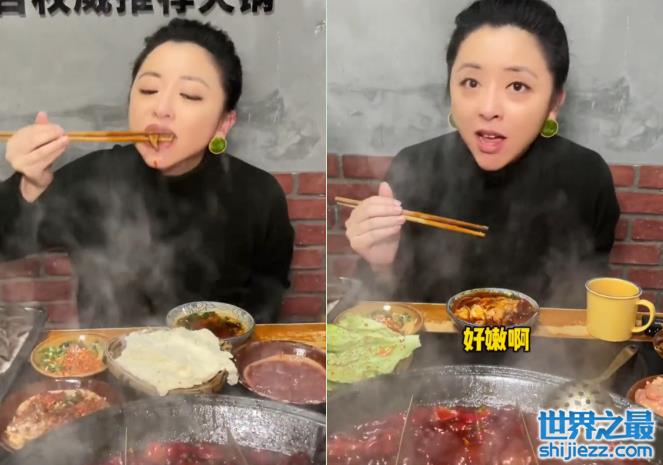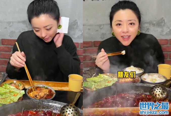 在搅和完火锅底料以后,黄小蕾便进店开启大快朵颐的模式,尝着各种毛肚、豆花、千层等美食,一上桌嘴巴就没停过,碗里更是盛得满满。在抬头吃毛肚时,油都滴在下巴上,吃得格外豪爽不在意形象。