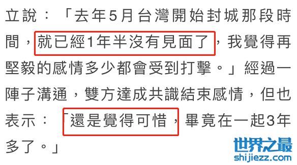 在被问到感情状况时,林又立表示和前男友因为特殊时期已经一年多没见面,虽然两个人都爱着彼此,但因为距离多少会影响感情。经过一阵子的思考,以及认真沟通,两人最终决定和平分手。林又立表示在一起已经三年虽然会很可惜,但分开也是明智决定。