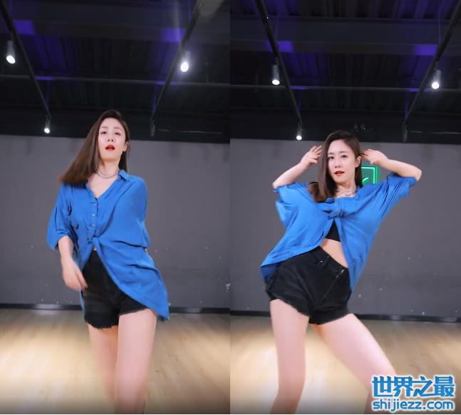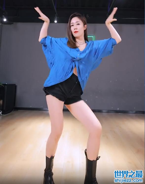 视频中,刘芸身穿一件蓝色衬衣,扣子只系了几颗,中间用衬衣两端系成结,露出一点点里面的黑色运动内衣,下身搭配黑色超短裤,脚踩黑色长靴,一身穿搭又酷又飒,十分性感火辣,青春少女感十足。