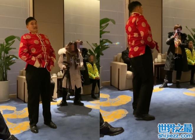视频中,大衣哥身穿红大褂装束打扮格外喜庆,脚踩锃亮皮鞋,从头到脚都精心打扮过一番,应为演出需要。只见他正同大家熟捻的聊着天,言语间很亲切,时不时抬起手比划讲得格外生动。