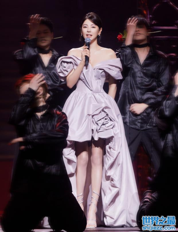 舞台上的张雨绮更是端庄优雅,被一群帅气的男伴舞围绕在中间。从张雨绮全身的造型来看,淡紫色长裙搭配绑带碎钻高跟鞋,在舞台上亭亭玉立,肌肤胜雪,一双大长腿更是纤细笔直,让人挪不开眼。