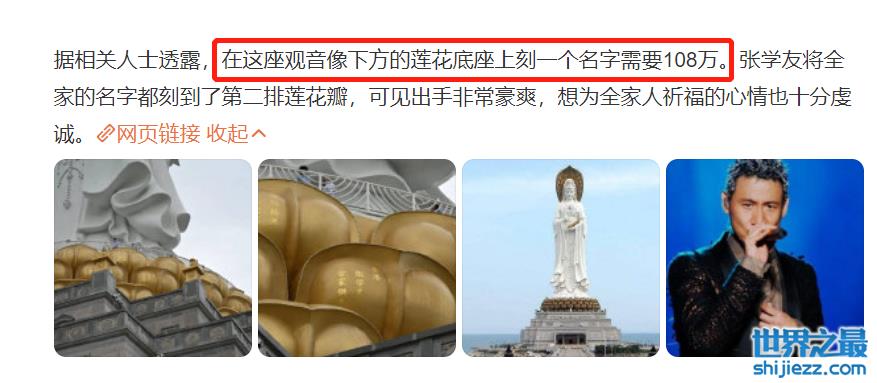 这座雕像位于海南三亚,知名度很高,据知情人士透露,在雕像的底座刻一个名字需要108万的费用,张学友将全家人的名字刻在上面,可见对家人十分重视。