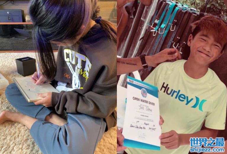 除了平时的日常之外,吴速玲也会分享孩子们的一些兴趣爱好,Grace喜欢画画,平时总会画一些卡通形象,画得十分可爱;而Joe喜欢潜水,此前还拿到了开放水域潜水员证,在照片中Joe笑得十分开心。