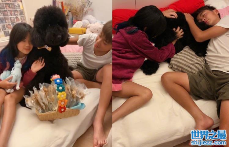 在家里小狗生日时,Joe和Grace亲昵的和小狗合照,抱着小狗一起睡觉,虽然兄妹俩长大了,但依旧可以看到小时候调皮可爱的影子。