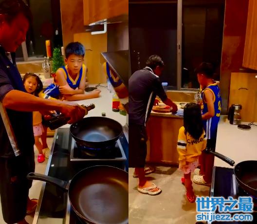郭斌不仅陪女儿逛夜市,还在社交平台晒出给自己儿子做炒饭的视频。视频中的老郭熟练的在厨房忙碌着,儿子女儿则安静的等待在一旁,眼里充满了期待,平常人家的幸福也不过如此了。
