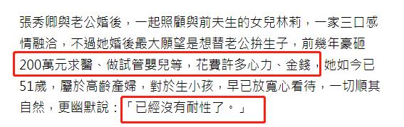 据悉,张秀卿作为艺人之所以一度曾胖到150斤,主要还是因为想和老公有一个孩子。八年前,张秀卿嫁给小12岁的老公王国,一直想和对方有个孩子。无奈年龄已高,只能花200万重金到处求医、做试管婴儿等,因为药物和养身体体重飙增。花费巨大的人力财力心力后,目前已经放宽心态,顺其自然。
