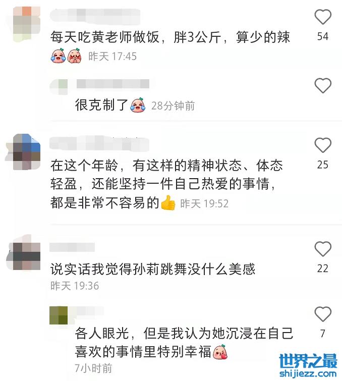 网友们在评论区纷纷留言,有网友说“每天吃黄老师做的饭,胖3公斤算少的啦”,也有网友对孙莉跳舞做出了评价,称“能坚持自己热爱的事情是非常不容易的”。正如网友所说,其实只要自己喜欢,便不用太过在意别人的评价。