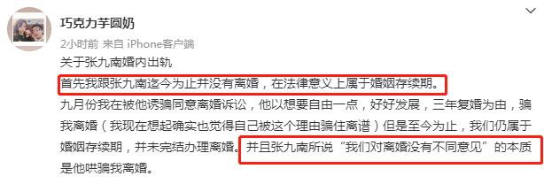 女方先强调自己和张九南目前并没有离婚,两人在法律上还属于夫妻关系,现在是在走离婚诉讼。女方爆料男方一直以“想自由、好好发展”为由诱骗女方离婚。还曾向女方许诺三年后复婚。