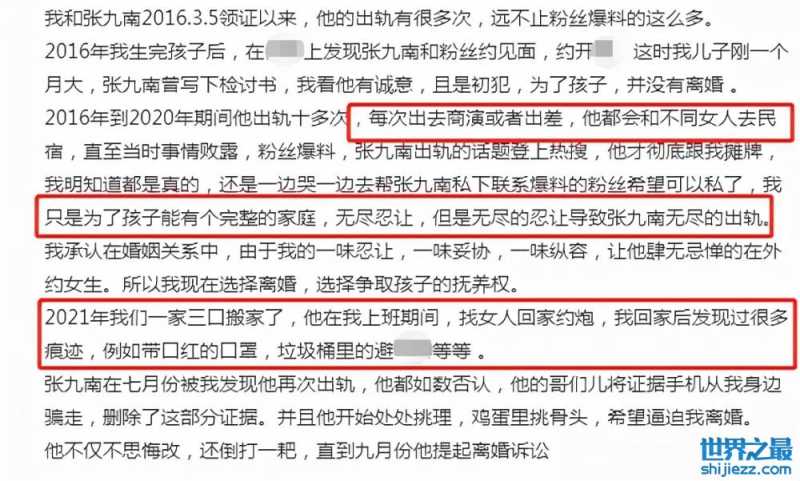 女方一度相信张九南的漂亮谎言,直到后面从粉丝爆料以及自己搜查到的线索,发现张九南婚内出轨太多次。结婚四年期间,张九南出轨不下于十次,不仅和粉丝见面发生关系,每次商演或出差,都会带女人去酒店。尽管女方知道粉丝爆料为真,但为了孩子,再加上张九南写保证书求和,她委曲求全忍了下来。直到忍无可忍后,女方才选择离婚并争取孩子抚养权,曝光张九南的恶劣行径。