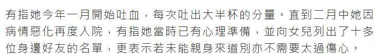 直到今年的一月中旬,她病情复发非常的快速,并且已经严重到开始吐血,每次吐出大半杯的分量,到了二月中旬的时候,她的病情已经恶化只能呆在医院之中。闺蜜也透露到这时候的祝文君已经做好了心理准备,并且向女儿列出了十多位身边的好友名单,还交待女儿如果亲友们不能亲自来道别,希望她们不要过于伤心。