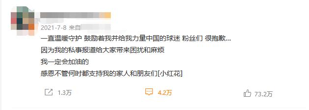 随后福原爱在自己的社交平台表示很对不起喜欢自己的粉丝朋友,因为她的私事而给大家带去困扰,并表示很感恩支持她的人,会继续加油。