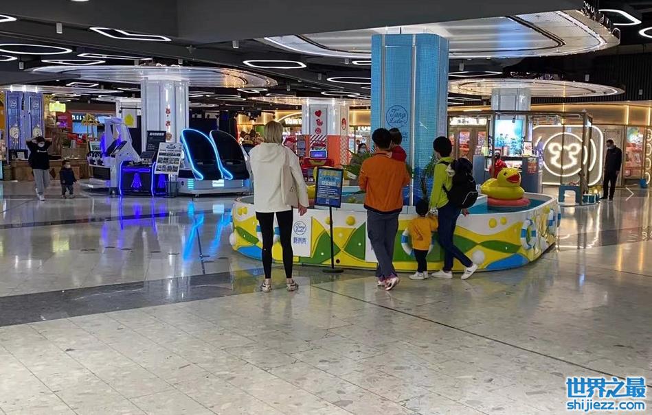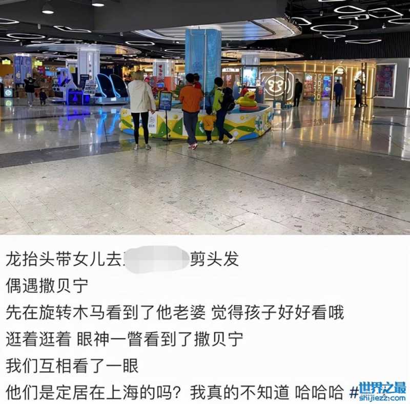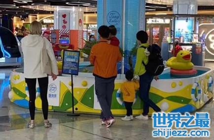 逛商场时有很多游乐设施,估计撒贝宁家的小朋友看到了也会想要玩一玩,所以他们站在游乐设施前观看,不知道小朋友们最后有没有坐上画面中的小鸭子。