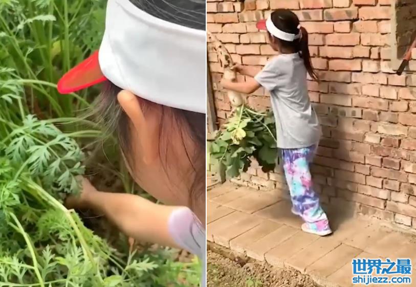 除了在外面运动、玩耍,甜馨还体验起了农活,戴着遮阳帽认真地拔着萝卜,拔出来后又一个人提着大萝卜走向别的地方,丝毫没有娇气的感觉。