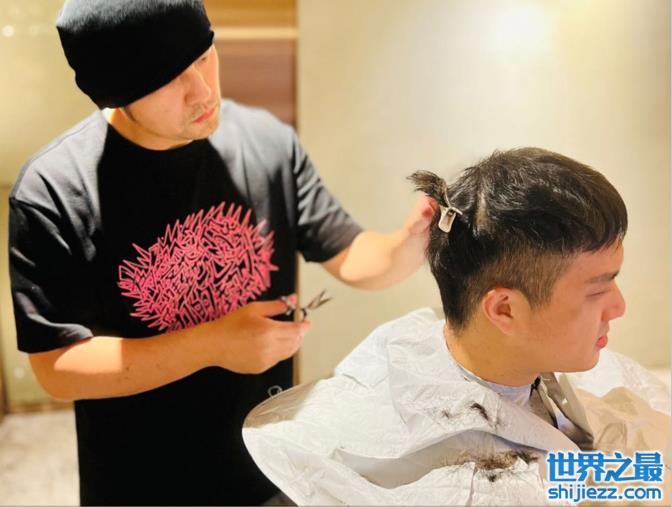 照片中,周杰伦头戴黑色包头巾,身穿黑色T恤,表情严肃认真,胡子拉碴,特别是鬓角分明,侧脸看去有一种嘻哈潮男的感觉,根本不像是43岁的人。只见周杰伦一只手拿着剪刀,一只手拿着梳子,为好友理发,而朋友看起来也很相信周杰伦,一点都没有担心的样子。