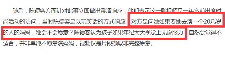 随后陈德容只好出面澄清,解释自己只是不愿意演二十几岁大孩子的妈,年纪太大,视觉上没有说服力。经纪人也出面澄清,甚至搬出了之前大S的话,印证陈德容这么想是没错的。