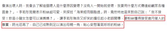 李若彤还反过来开导这位粉丝,要她懂得接受岁月催人老的事实,也希望粉丝能相信自己她,时光荏苒,自己已经成熟到可以演出母亲一角。这种清醒自觉,某些扮嫩的明星怎么就不能学学呢?