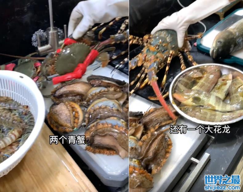 在厨房中,该博主晒出了当天食材摆满整个料理台的画面,满满一桌子琳琅满目的海鲜,看起来不像是家中的厨房,反而更像是一个小型的海鲜市场。