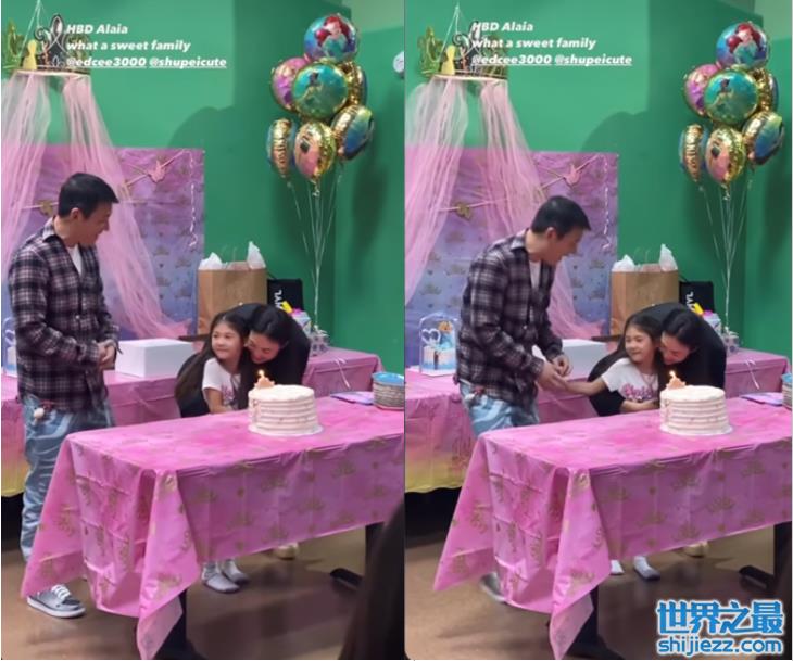 视频中,陈冠希为女儿举办了隆重的生日派对,在一个绿色背景的大房间内,用粉色纱幔布置出如同卡通里的“公主城堡”,而在桌子上放了一个大蛋糕为女儿庆生。