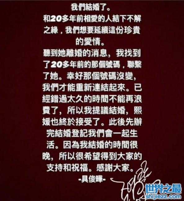 具俊晔:我要结婚了,想和20年前相爱的女人延续爱情,听到她离婚的消息,我找到了20年前的那个号码联系了她。幸好那个号码没变,我们才能重新连接起来,时间已经过去很久,不能再浪费了,所以我提议结婚,她也接受了,决定一起生活……希望大家多多支持和祝福,谢谢。
