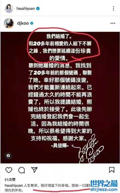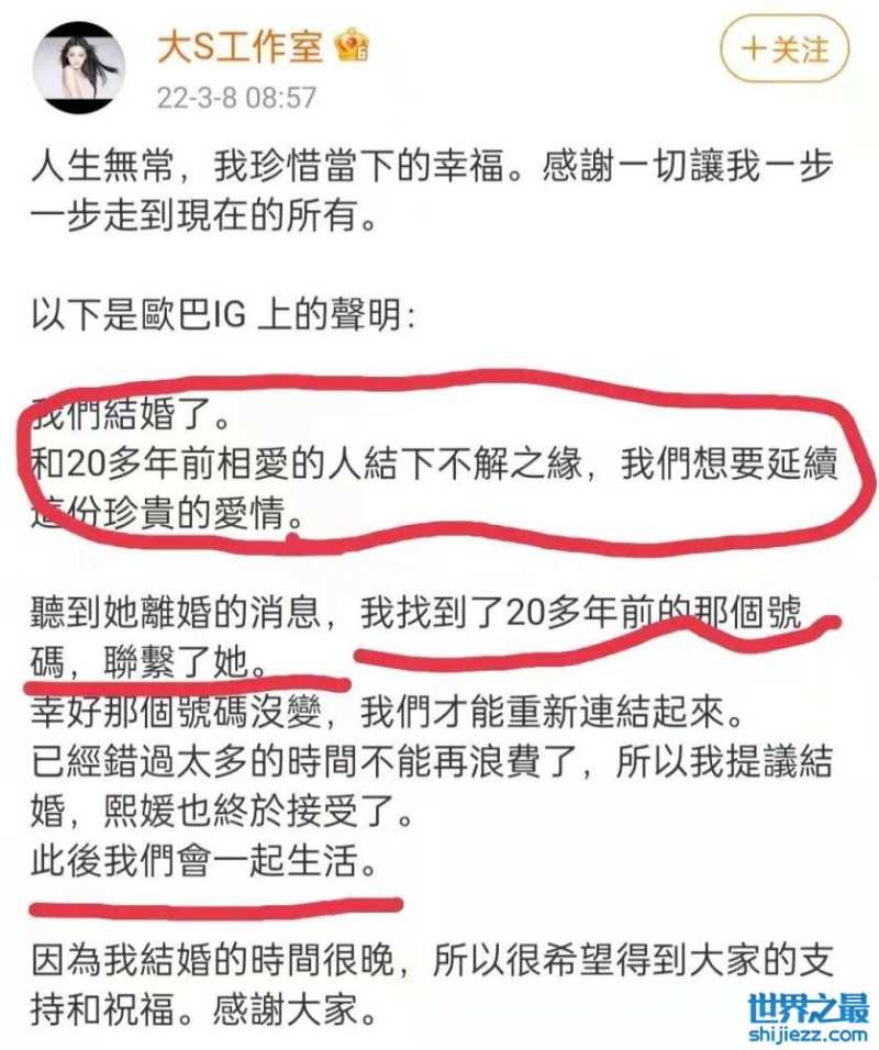 具俊晔官宣和大S结婚,大S也承认再婚,评论回复道,“人生无常,我珍惜当下的幸福,感谢一切上我一步一步走到现在的所有”。