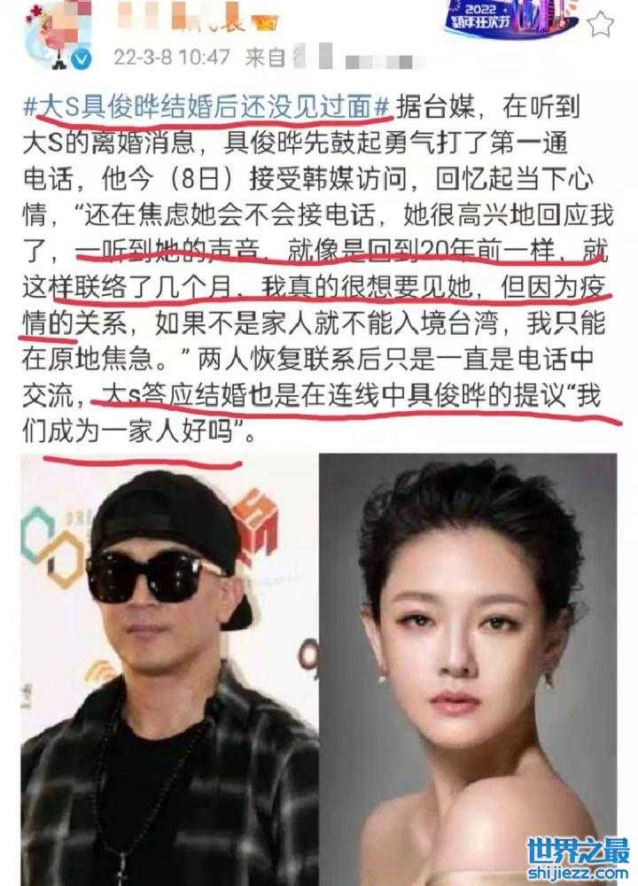 大S承认结婚后,同时回应了婚礼的事情,她明确表示不会再办婚礼,也不会生育。另外,她还透露和具俊晔结婚后,因为疫情影响,双方到现在还没有见过面。根据具俊晔友人透露,具俊晔和大S以视频联络,男方不会说中文,他们通过英文夹杂韩文沟通。具俊晔希望能带大S回韩国生活,但女方母亲并不同意。