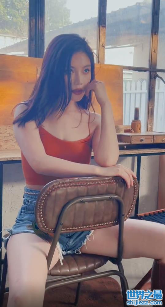 双腿跨坐在凳子上的徐冬冬秀出一双白嫩大长腿,单手托住脸颊显得女人味十足。