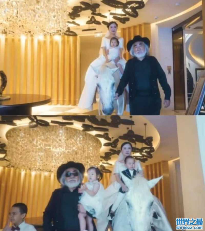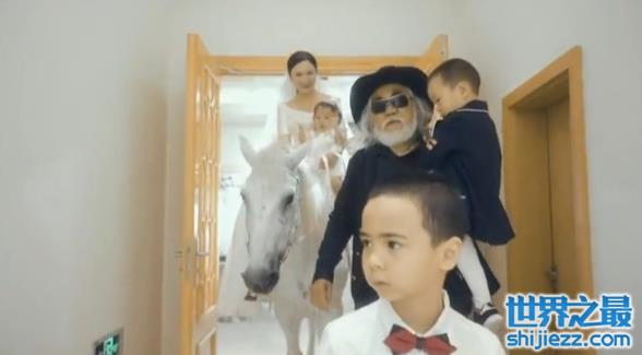 只见张纪中西装革履打扮正经,脸颊一圈白色络腮胡,单手牵着白马一路前行。而娇妻则怀抱女儿,母女二人安稳坐在白马上。不得不说两口子的打扮正经加上酒店豪华的背景渲染,乍一看便像结婚现场。