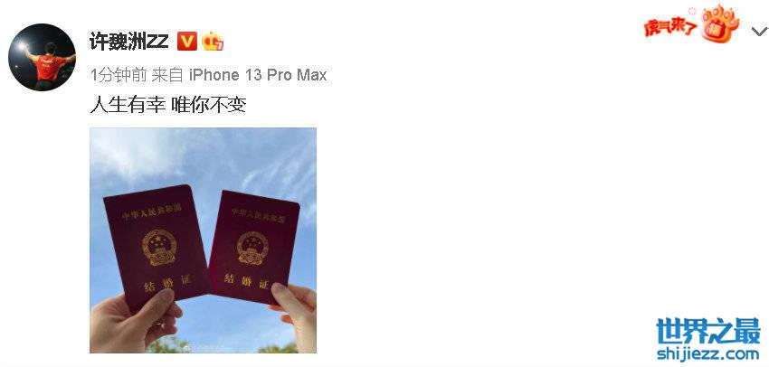 许魏洲在13点14分卡点晒出结婚证,并且告诉大家自己结婚了。