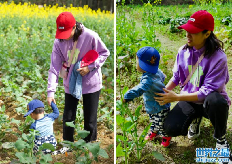 朱丹带孩子下地摘野菜!身上挂一个大水壶,儿子坐泥地玩耍不怕脏 ...