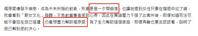 福原爱自从被曝出离婚之后,外界的形象就一落千丈。但是作为律师的赖芳玉表示,对于这种厌女文化感到很心疼,即便是司法不站在她这边,仍然想帮助福原爱,还说自己要尽全力帮助这个家庭,再难也要去试试看。