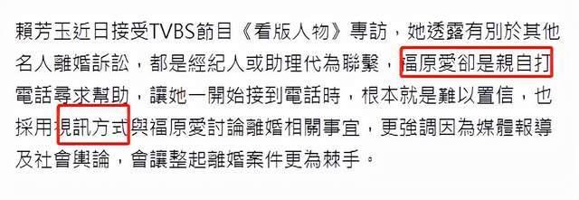 近日,福原爱的离婚细节曝光。福原爱的律师赖芳玉近日在接受专访时表示,其他艺人都是经纪人或者助理打电话咨询,而福原爱则是本人亲自打电话求助,两人全程都是采用视频通画的方式来讨论相关的事宜。