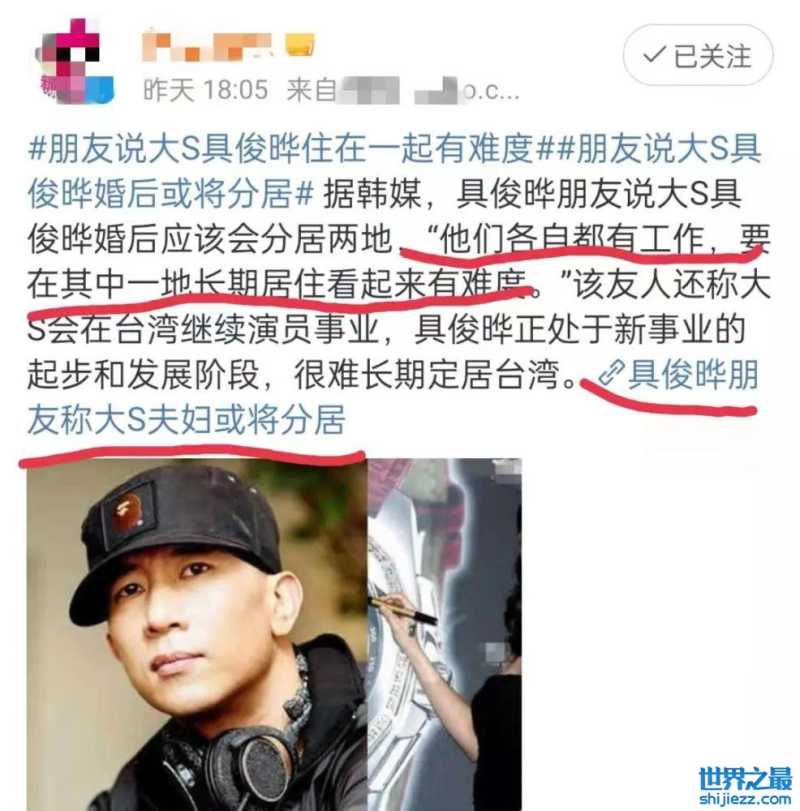 目前,具俊晔已经到达台湾,正在隔离中,之后会和大S见面。对于他俩最后是定居在台湾,还是韩国,网上有很多争议,当事人朋友说,具俊晔和大S会很有难度,因为双方各自都有事业,很可能他们婚后会分居。
