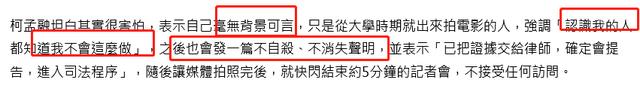对于被指控的细节也在发布会曝光,柯孟融说这些事都说他没做过的。称对方有黑道背景,一开口就是向他敲诈500万。说他这个电影还没有收益,自己只是从大学就开始老老实实拍片的老实人,对于对方的敲诈很害怕。