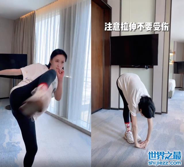 换好衣服的倪虹洁来到另外一处活动区域,上来就是一个侧踢腿,看上去相当轻松。运动完之后的倪虹洁开始拉伸,身体柔软度令人羡慕。看得出来倪虹洁身材管理很严格,纤瘦的身材也是非常吸睛。