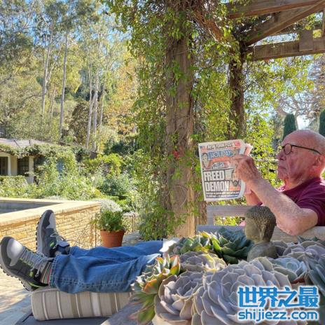 照片中,默多克坐在自家别墅外的花园里,双腿架在沙发上,悠闲地看着报纸,外面树木成荫,阳光明媚,在这样豪华且舒适的环境里生活,也就难怪默多克能在91岁高龄,依旧生龙活虎,精力充沛了。