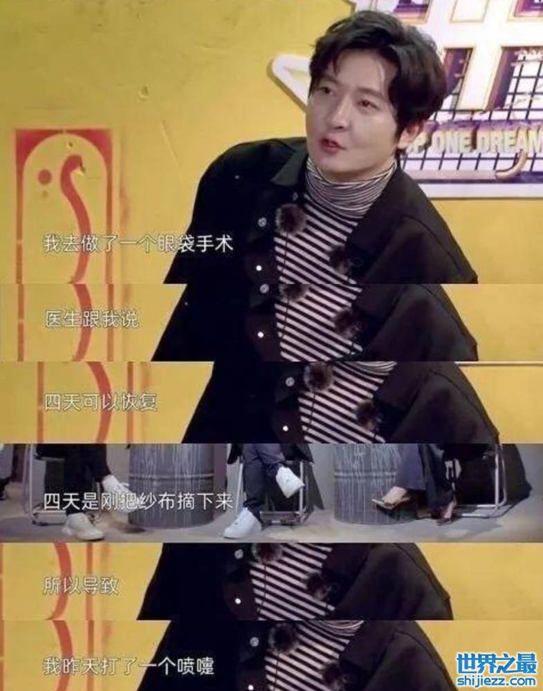 但郭京飞自己忍不了,在2020年初把眼袋割了。当时他正参加综艺录制,突然中途离场,然后他对着镜头解释:因为昨天打了一个喷嚏,把割完眼袋的缝合线给崩开了,现在要重新去补救一下。医生还说,一般割完眼袋4天就能工作了,所以他才会来录节目。