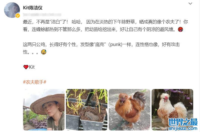 近日,新加坡歌手陈洁仪在自己的社交账号上发布了一篇自己田园生活的组图,她还配文说道最近自己不再“洁白”了,同时她晒了几张自己种的菜和养的公鸡,笑称公鸡发型十分punk和他们的性格一模一样。