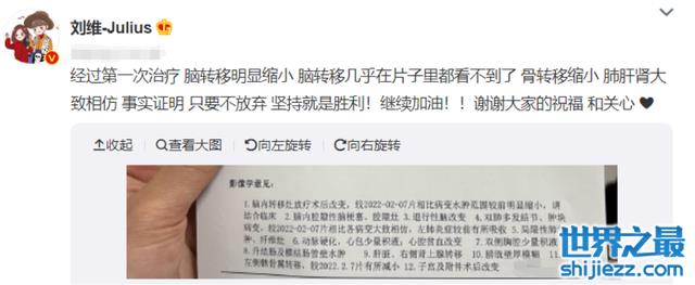 近日歌手刘维在自己的社交平台更新了一则消息,他简单说明了自己母亲目前的病情,说经过第一次治疗,脑转移几乎在片子里看不到了,明显缩小,全身各处包括骨转移,肺肝肾的转移都缩小了,能看出母亲的病情在好转,刘维也十分激动。