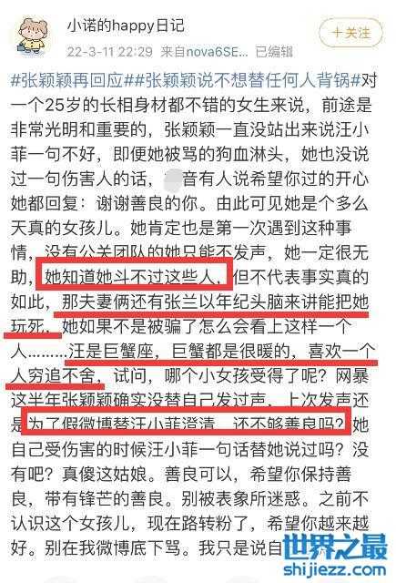 其中提到,说张颖颖没有公关团队,很无助,她知道自己斗不过那些人。那夫妻(汪小菲大S?)还有张兰,他们的头脑能把她(张颖颖)玩死。这样来看,张颖颖之所以不敢说出全部的事情,是怕自己斗不过那些人。