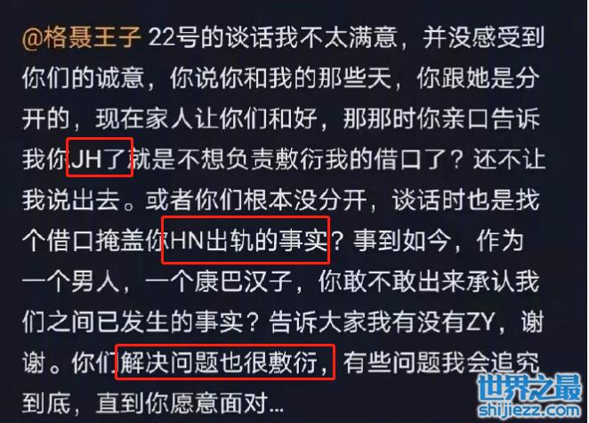 并在社交平台发文称,丁真的舅舅骗女生自己已经和妻子分开,找女生谈话为了掩盖他舅舅婚内出轨的事实。并觉得他们处理问题的方式很敷衍,没有诚意。表示自己会继续追究相关的问题,也希望他舅舅作为一个康巴汉子能够勇敢地承认他们之间已经发生的事实。