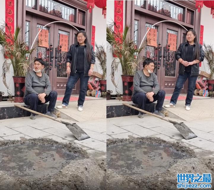 只见大衣哥朱之文穿着一件灰色秋衣,,浑身上下看起来有些脏兮兮的,脸色发白,额头上还有些汗珠,一旁还放着一把铁锹和一堆水泥。明显就能看出朱之文刚才是在家搅水泥,最后干累了只好坐在地上休息。