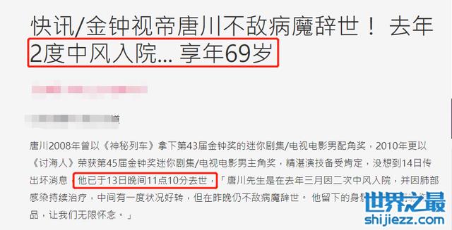 据悉,唐川先生是在13日晚上十一点去世的,虽然其家人并未透露唐川具体因什么病而去世,但是他去年曾二次因中风入院,肺部也感染。在治疗期间,唐川的病情一度好转,不过最终还是不敌病魔长辞于世。