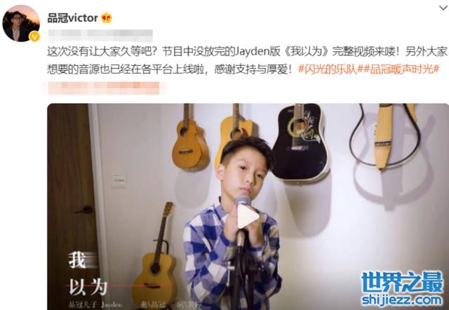 近日,歌手品冠在自己的社交平台发布了一段自己儿子的演唱视频,他发文称大家期待的Jayden版的《我以为》完整版来了,同时还感谢了各位的支持与厚爱。