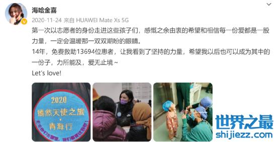 也是在2020年11月,海哈金喜发过一条微博说自己第一次参加嫣然天使的公益活动。