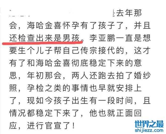 3月14日,李亚鹏再婚娶小19岁女友海哈金喜的消息被网友广泛热议,与此同时,李亚鹏也官宣自己再次当爸的喜讯,这真是双喜临门,对于李亚鹏来说,人到50岁还能拥有一份浪漫爱情并且还开花结果有了爱情结晶,想想都觉得人生很圆满了,李亚鹏也收到了外界亲朋好友的祝福。
