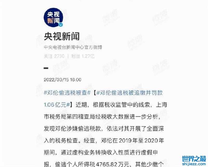 综合考虑上述情况,上海市税务局第四稽查局依据相关法律法规规定,按照上海市税务行政处罚裁量基准,对邓伦追缴税款、加收滞纳金并处罚款,共计1.06亿元。