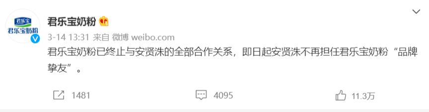 最后一个与邓伦终止合作的品牌是君乐宝,虽然解约的动作慢一点,但也及时表明了态度,而且君乐宝连续两日代言人都惨遭翻车,品牌方也是真惨,接下来品牌方还要立即拆除邓伦所有的广告宣传,这也是一个不小的工程。