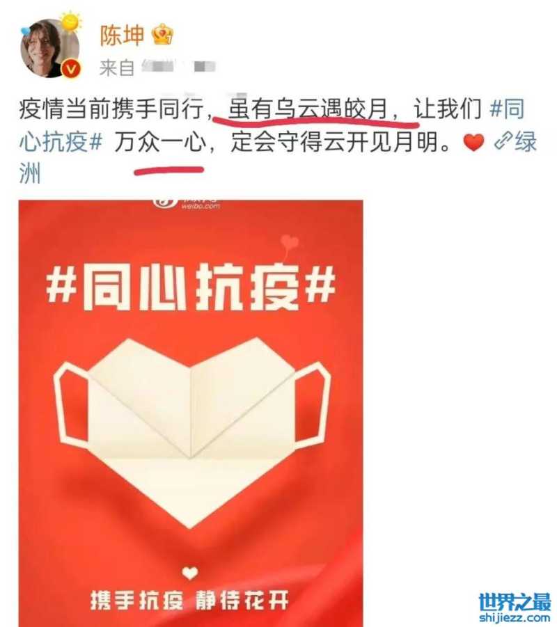 疫情期间,很多明星纷纷发文,表示共同抗疫,共渡难关。陈坤也不例外,只是他这文案,显然是从工作人员那复制粘贴的,看上去很敷衍,感觉没什么诚意。